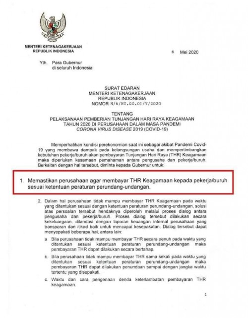 Portalriau.com-Jakarta - Menteri Ketenagakerjaan Ida Fauziyah telah menerbitkan Surat Edaran (SE) Nomor M/6/HI.00.01/V/2020 Tentang Pelaksanaan Pemberian Tunjangan Hari Raya Keagamaan Tahun 2020 di Perusahaan Dalam Masa Pandemi Corona Virus Disease 2019 (Covid-19). Dalam SE…...