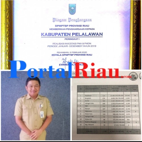Portalriau.com-Pangkalan Kerinci, Dinas Penanaman Modal Dan Pelayanan Terpadu Satu Pintu (DPMPTSP) Provinsi Riau memberikan penghargaan kepada Kabupaten Pelalawan dengan pencapaian peringkat I sebesar 45,56% realisasi Investasi Pemilik Modal Asing ( PMA ) dan Penanaman Modal…...
