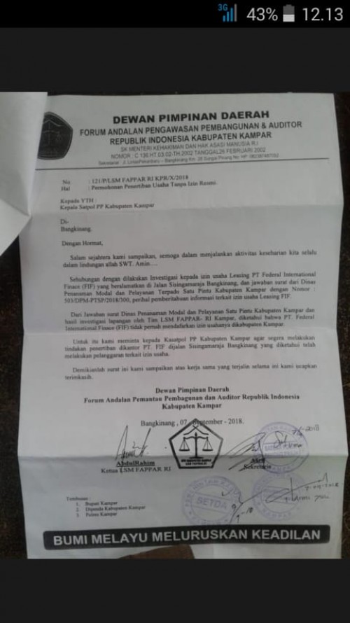 Kampar, portalriau.com - Dewan Perwakikan Daerah Lembaga Swadaya Masyarakat Forum Andalan Pemantau Pembangunan dan Auditor Republik Indonesia (DPD LSM FAPPAR RI) Kabupaten Kampar, melaporkan salah satu perusahaan pembiayaan PT. FIF yang beralamatkan di…...