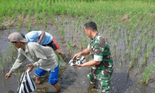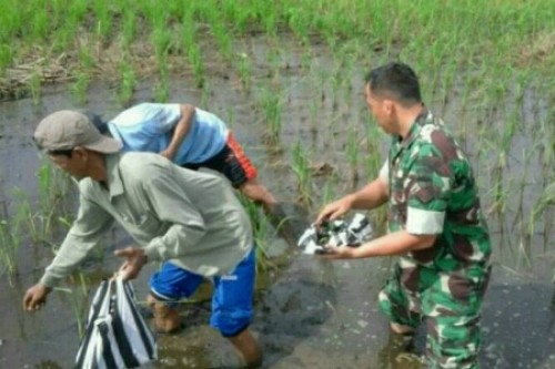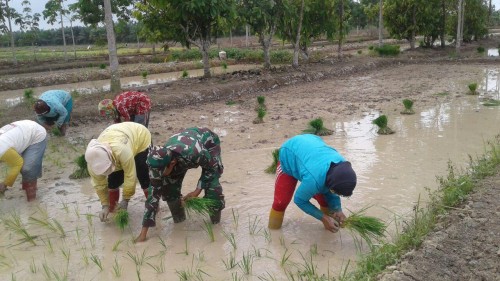 PORTAL RIAU , Kuala Cenaku(23/2/17) - Bintara Pembina Desa (Babinsa) Sertu Suroso, turun ke sawah membantu petani di Desa Pulau Jumat, menanam padi 42 di lahan seluas 5 hektare milik kelompok tani…...